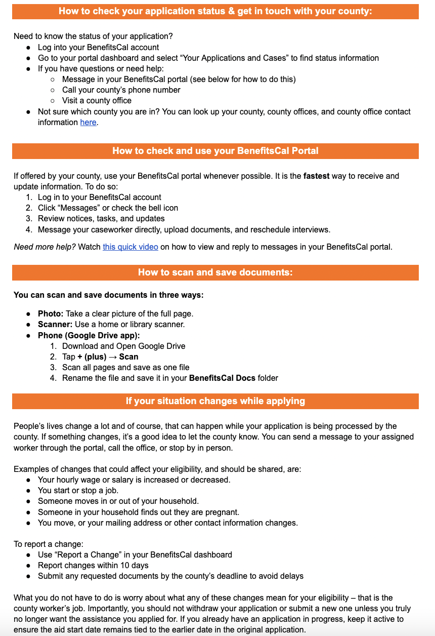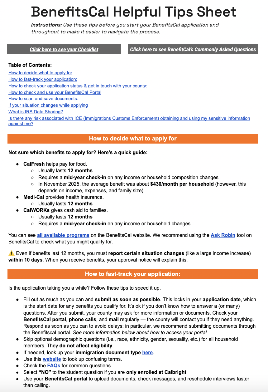 Students also described the Helpful Tips Sheet as a practical resource they returned to over time. One student who had not previously applied for CalFresh because they assumed they were ineligible learned about BenefitsCal’s chatbot assistant, Ask Robin, through the Tips Sheet. While tools like Ask Robin cannot account for every individual circumstance, the student used it to quickly gain a clearer sense of their likely eligibility and felt more confident continuing with the application.